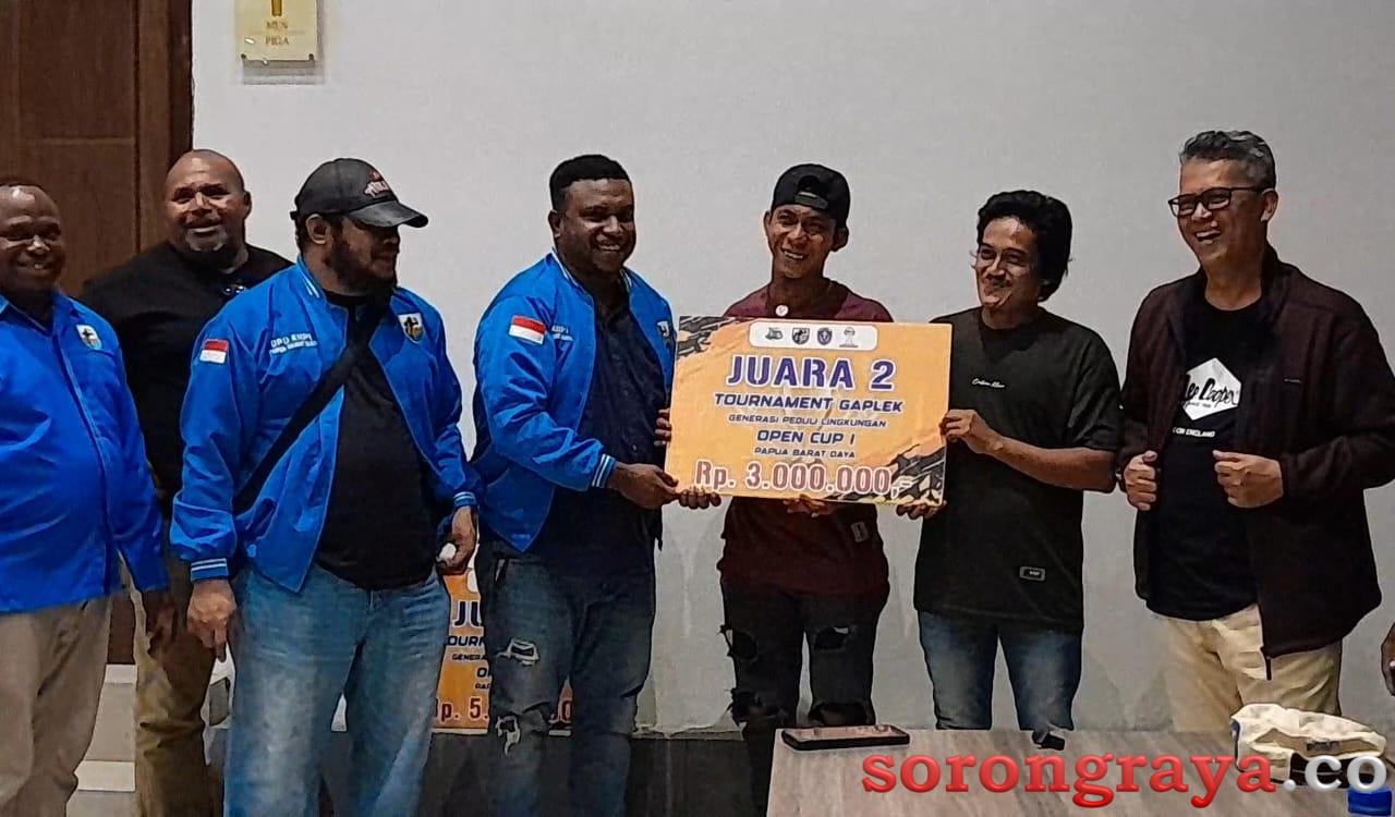 Caretaker Sekretaris KNPI Provinsi Papua Barat Daya, Izack Yable menyerahkan bantuan uang tunai kepada juara 2 Tournament Gaplek Cup I. [foto: sr]