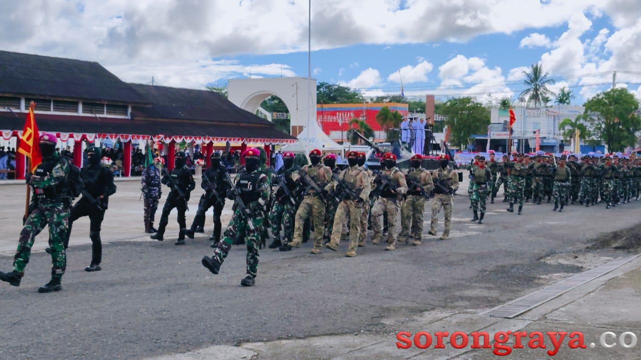 SORONG,sorongraya.co-Peringatan Hari Ulang Tahun (HUT) ke-80 Tentara Nasional Indonesia (TNI) berlangsung meriah dan penuh khidmat di Alun-Alun Aimas, Kabupaten Sorong, Papua Barat Daya, pada Minggu pagi, 5 Oktober 2025.
