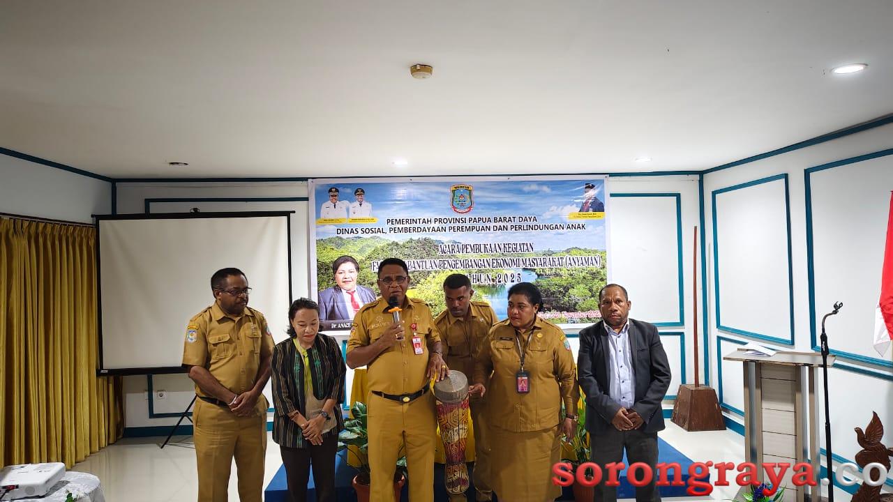 SORONG,sorongraya.co-Pemerintah Provinsi Papua Barat Daya melalui Dinas Sosial menggelar kegiatan Fasilitasi Bantuan Pengembangan Ekonomi Masyarakat berupa pelatihan anyaman berbahan lokal bagi Orang Asli Papua (OAP). Bertempat di Mariat Hotel, Selasa (25/11/2025),