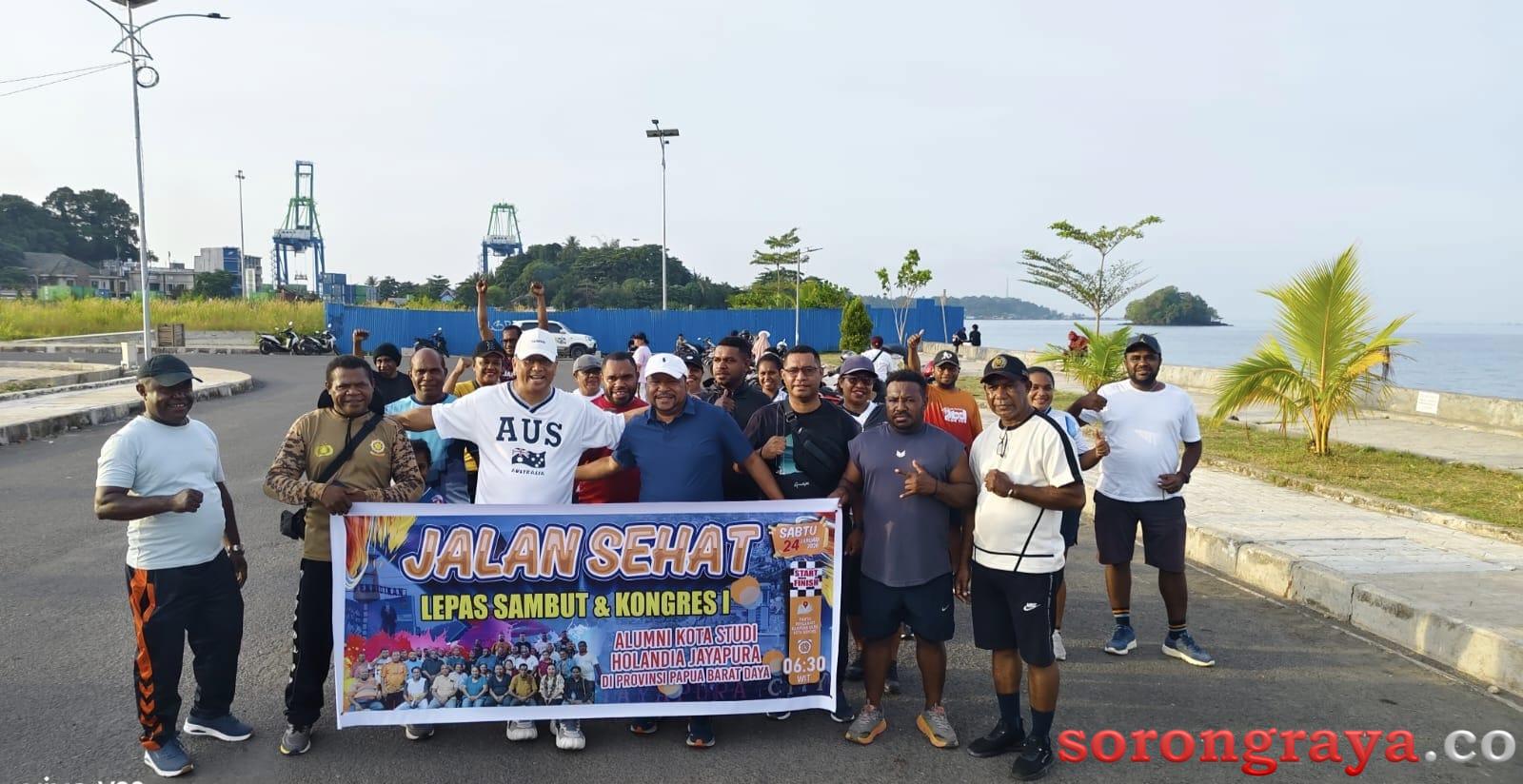 SORONG,sorongraya.co-Menjelang acara lepas sambut dan Kongres Pertama Alumni Kota Study Hollandia, seluruh alumni Hollandia di wilayah Papua Barat Daya, khususnya Kota Sorong dan Kabupaten Sorong, menggelar kegiatan jalan sehat pada Sabtu, (24/01/2026).