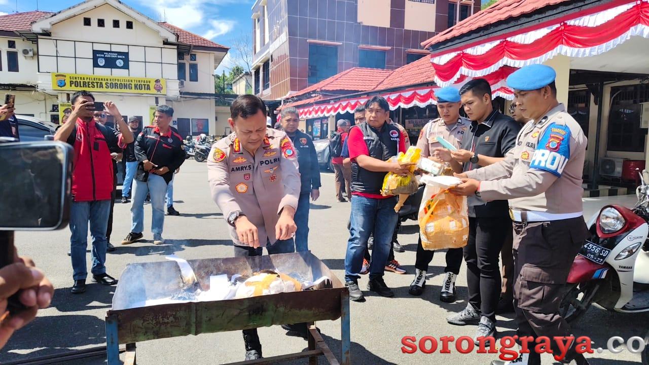 SORONG, sorongraya.co- Polresta Sorong Kota memusnahkan barang bukti narkotika jenis ganja seberat 3,4 kilogram dan sabu seberat 7 gram di halaman Mapolresta Sorong Kota, Selasa (5/8/2025).