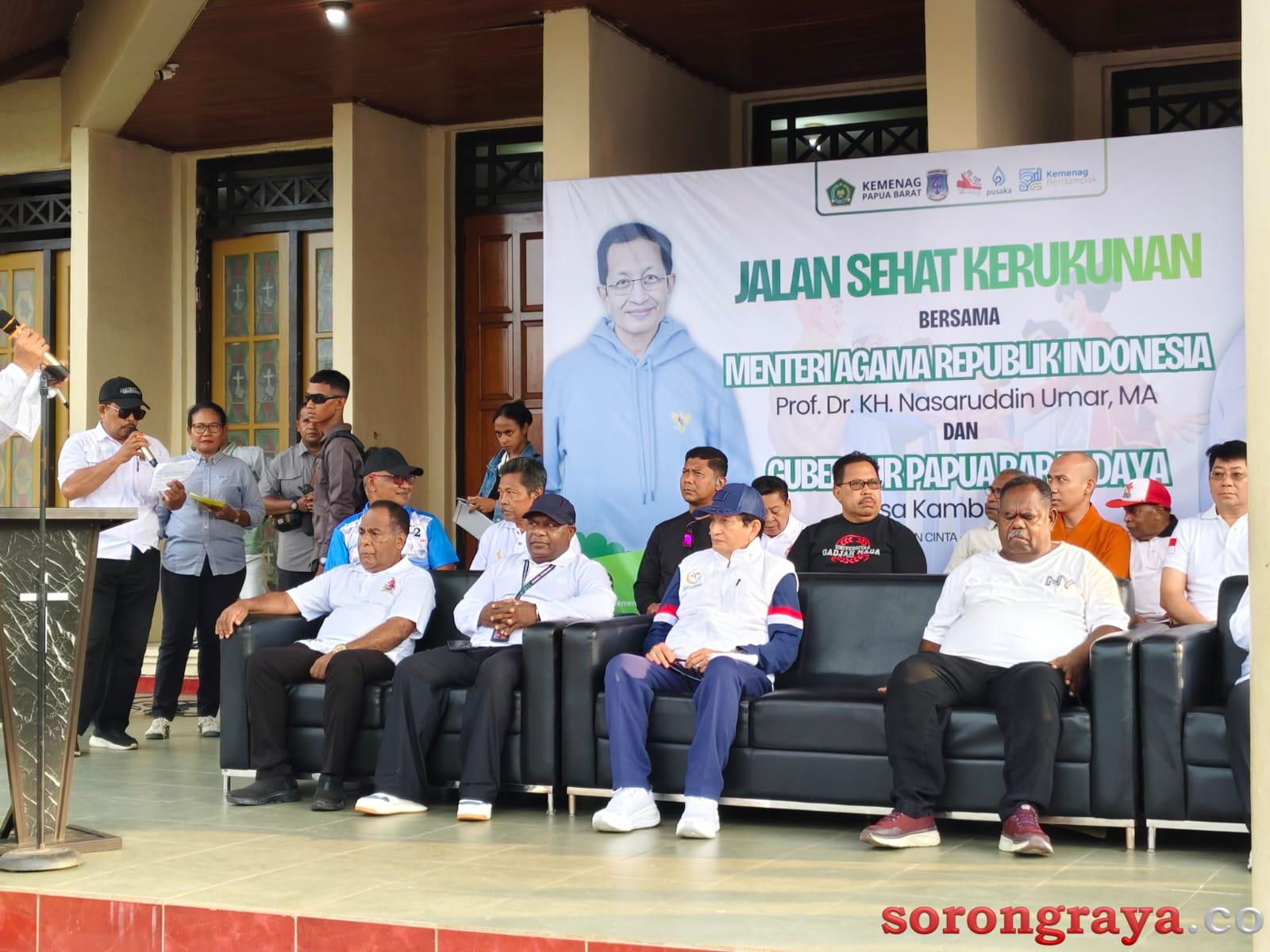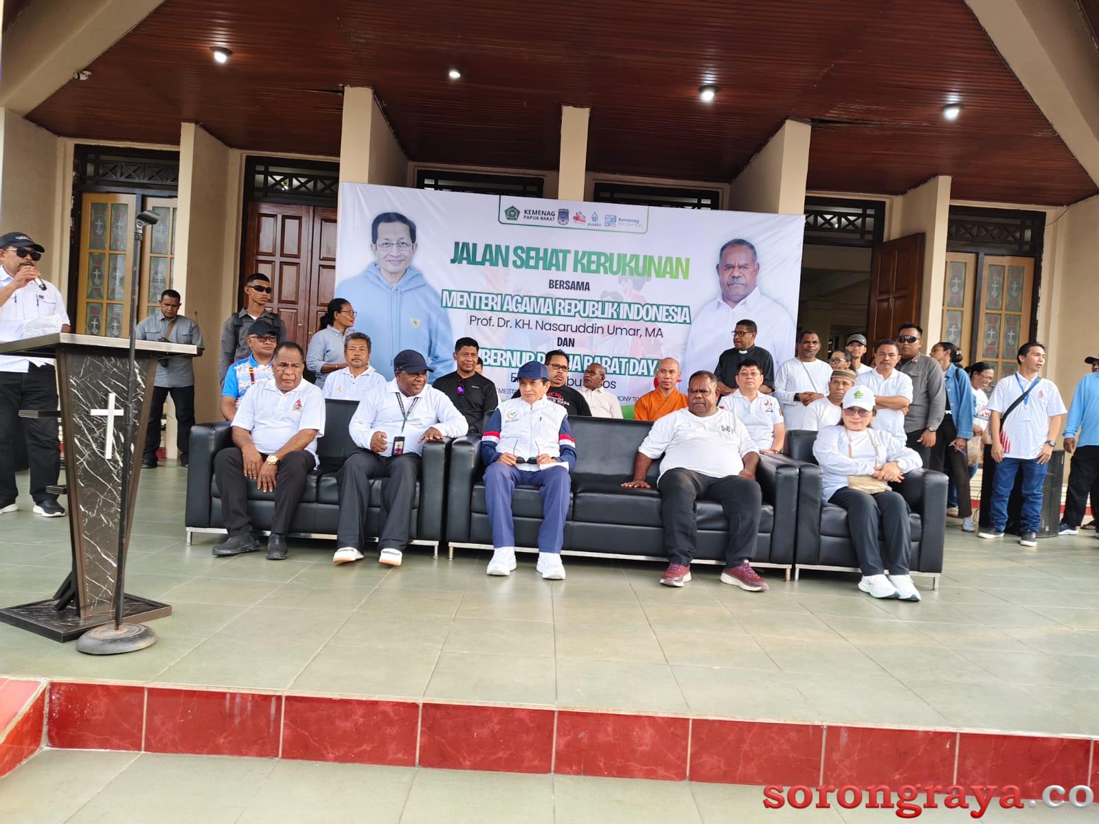 SORONG,sorongraya.co-Semangat toleransi dan kerukunan Menteri Agama Republik Indonesia, Dr. K.H. Nasaruddin Umar bersama Gubernur Papua Barat Daya Elisa Kambu melalui kegiatan Jalan Sehat Kerukunan yang dimulai dari halaman Gereja GKI Maranatha dan berakhir di Masjid Raya Al Akbar Kota Sorong, Sabtu pagi (13/12/25).