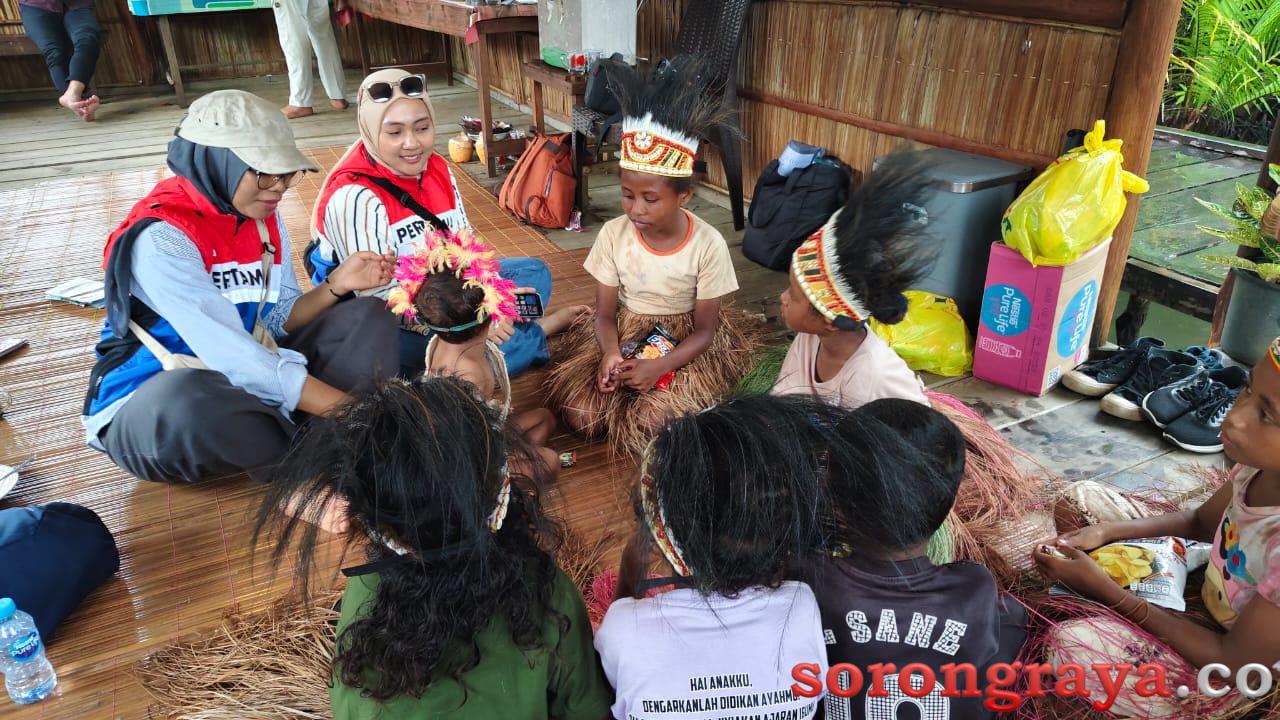 Karyawan PT. Pertamina RU VII Kilang Kasim berinteraksi dengan anak-anak setempat dalam kegiatan sosial, sebagai wujud kepedulian terhadap masyarakat dan pelestarian budaya lokal. Sabtu, (04/10/2025). [Foto:sorongraya.co/Trisatrisnah].