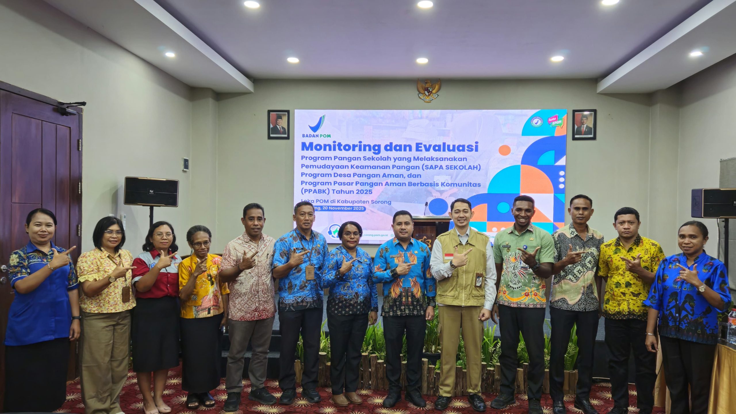 SORONG,sorongraya.co-Loka POM Sorong menggelar kegiatan Monitoring dan Evaluasi Program Pangan Sekolah yang Melaksanakan Pemudayaan Keamanan Pangan (SAPA Sekolah), Program Desa Pangan Aman, serta Program Pasar Pangan Aman Berbasis Komunitas (PPABK) Tahun 2025. Kegiatan tersebut berlangsung di Vega Hotel Sorong, Kamis, 20 November 2025.