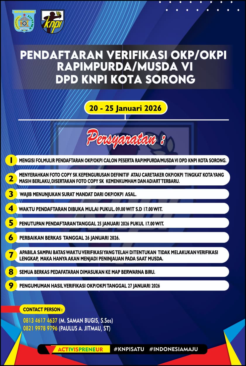 SORONG, sorongraya.co – Panitia Pelsakana Rapat Pimpinan Daerah, Komite Nasional Pemuda Indonesia Kota Sorong kini membuka pendaftaran organisasi kepemudaan se Kota Sorong, pendaftaran ini dalam rangka pelaksanaan Rapat Pimpinan Daerah yang akan digelar pada 29 Januari 2026 mendatang.