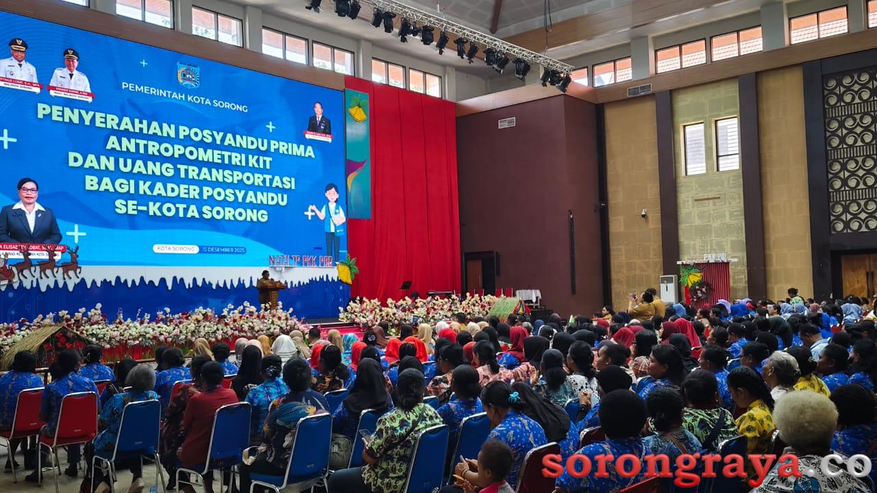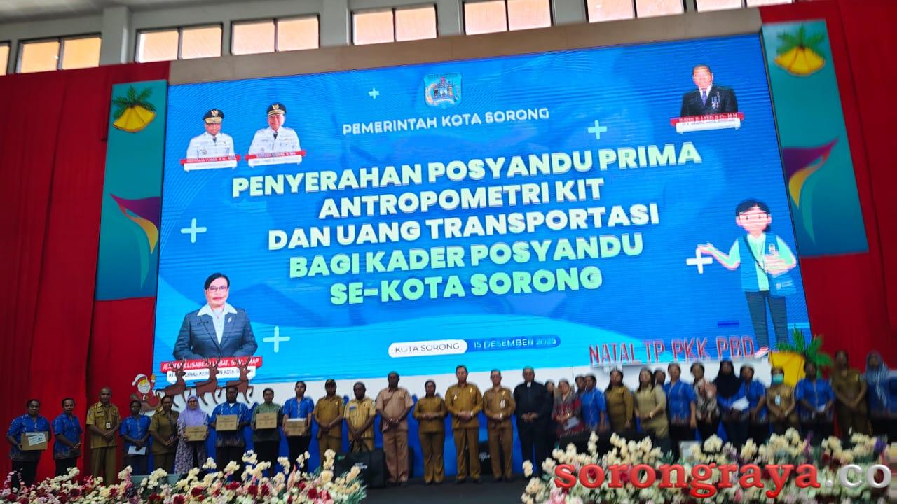 SORONG, sorongraya.co-Pemerintah Kota (Pemkot) Sorong menyerahkan Posyandu Prima Antropometri Kit serta uang transportasi bagi kader Posyandu se-Kota Sorong. Kegiatan ini berlangsung di Gedung Lambert Jitmau, Kota Sorong, Papua Barat Daya, Senin (15/12/2025).