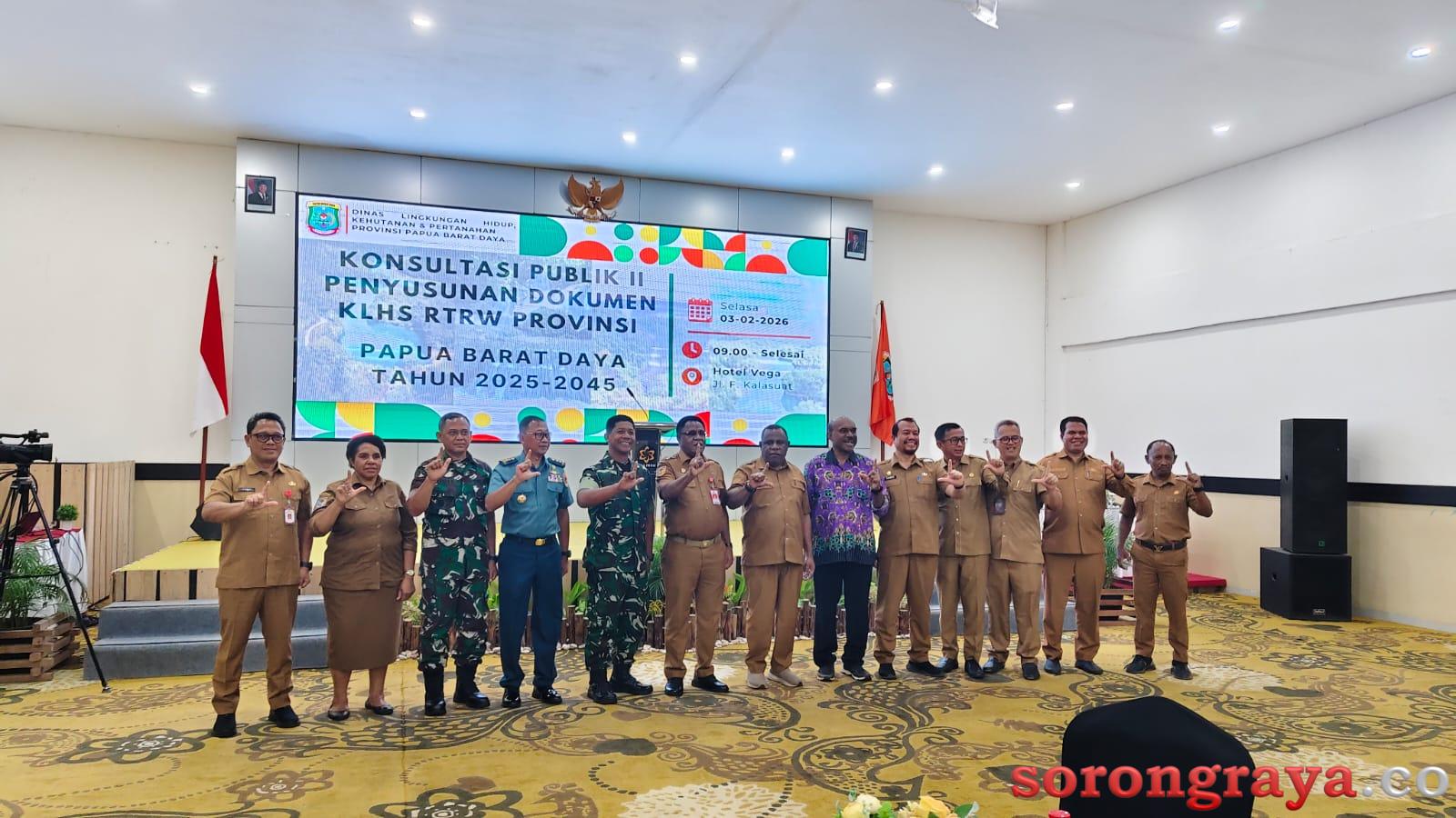 SORONG,sorongraya.co-Pemerintah Provinsi Papua Barat Daya melalui Dinas Lingkungan Hidup, Kehutanan dan Pertanahan menggelar Konsultasi Publik II Penyusunan Dokumen Kajian Lingkungan Hidup Strategis (KLHS) Rencana Tata Ruang Wilayah (RTRW) Provinsi Papua Barat Daya Tahun 2025–2045, yang dilaksanakan di Vega Hotel Sorong, Selasa, 3 Februari 2026.