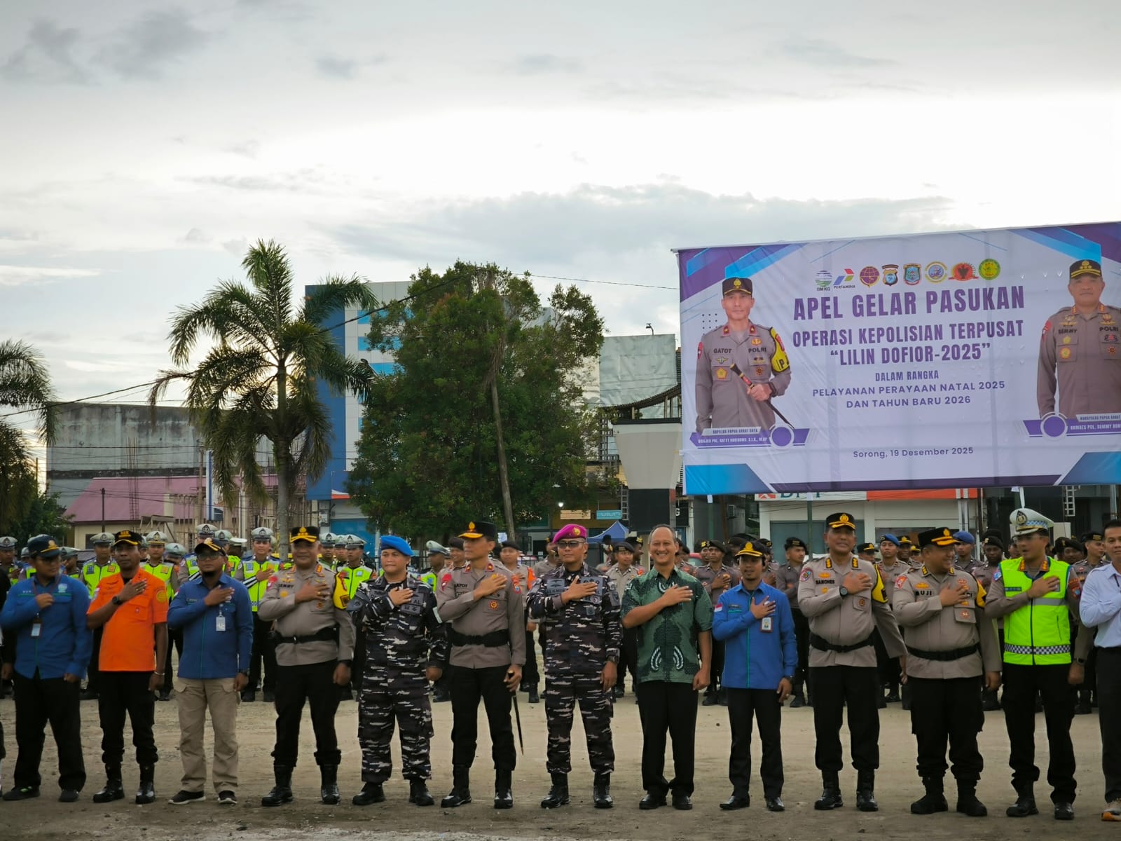 SORONG, sorongraya.co – Polda Papua Barat Daya menggelar apel pasukan Operasi Kepolisian Terpusat Lilin Dofior 2025 dalam rangka pengamanan perayaan Natal 2025 dan Tahun Baru 2026. Bertempat di Alun-alun Aimas, Kabupaten Sorong, Jumat (19/12/2025).