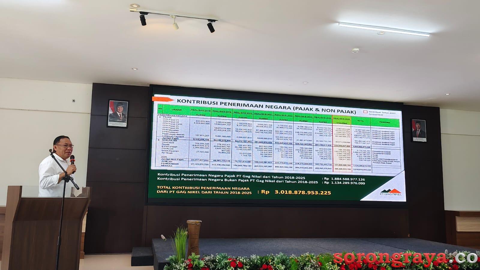 SORONG,sorongraya.co-PT Gag Nikel kontribusi pajak dan non pajak ke negara sepanjang tahun 2018-2025 sebesar Rp. 3,01 Triliun.