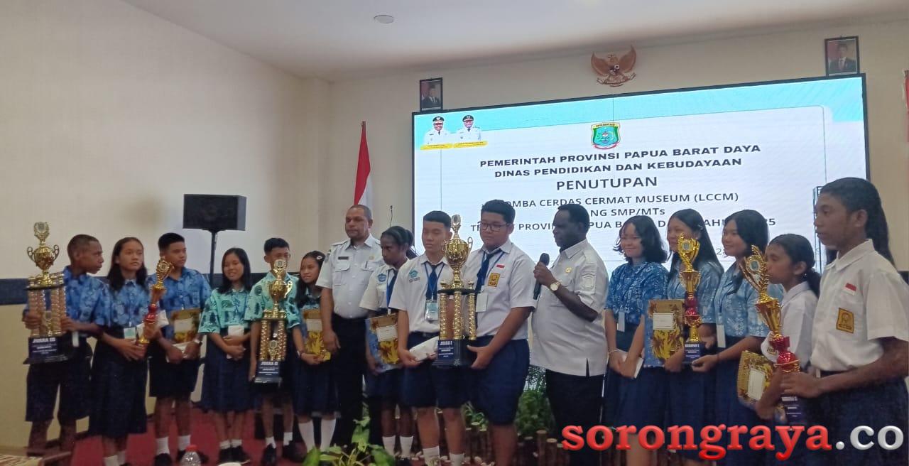 SORONG,Sorongraya.co, – Pemerintah Provinsi Papua Barat Daya(Pemprov PBD) mengumumkan Pemenang Lomba Cerdas Cermat Museum(LCCM) sekaligus menutup acara Lomba yang sudah berlangsung selama 3 Hari diikuti oleh Peserta Jenjang SMP/MTS Kabupaten dan Kota tingkat Provinsi PBD Tahun 2025 di Hotel Vega Prime Sorong. Rabu, 30 April 2025.
