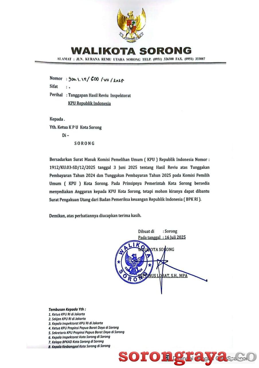 “Dalam isi surat itu, Wali Kota Sorong menyebutkan bersedia menyediakan anggaran kepada KPU Kota Sorong, tetapi mohon kiranya dapat dibantu surat pengakuan utang dari BPK RI,” tambahnya.
