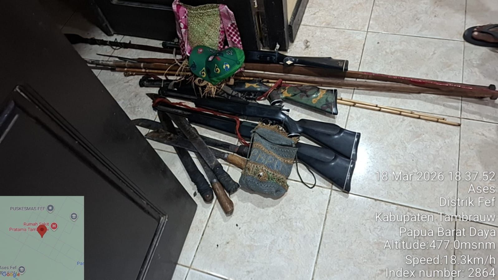 “Barang bukti yang diamankan antara lain 7 senapan angin, 7 parang, 4 noken, 3 tombak, 11 anak panah, serta berbagai barang lainnya seperti handphone, peluru senapan angin, hingga benda yang diduga jimat,” ujarnya.