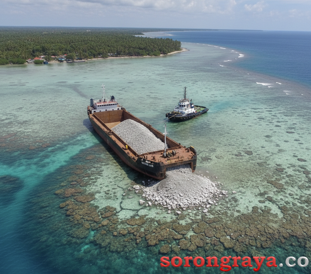 SORONG, sorongraya.co – Kapal jenis Tongkang dengan lambung bertulislkan Bahari 248 karam di pantai Tanjung Dore Distrik Makbon, Kabupaten Sorong pada Senin (8/12/2025).