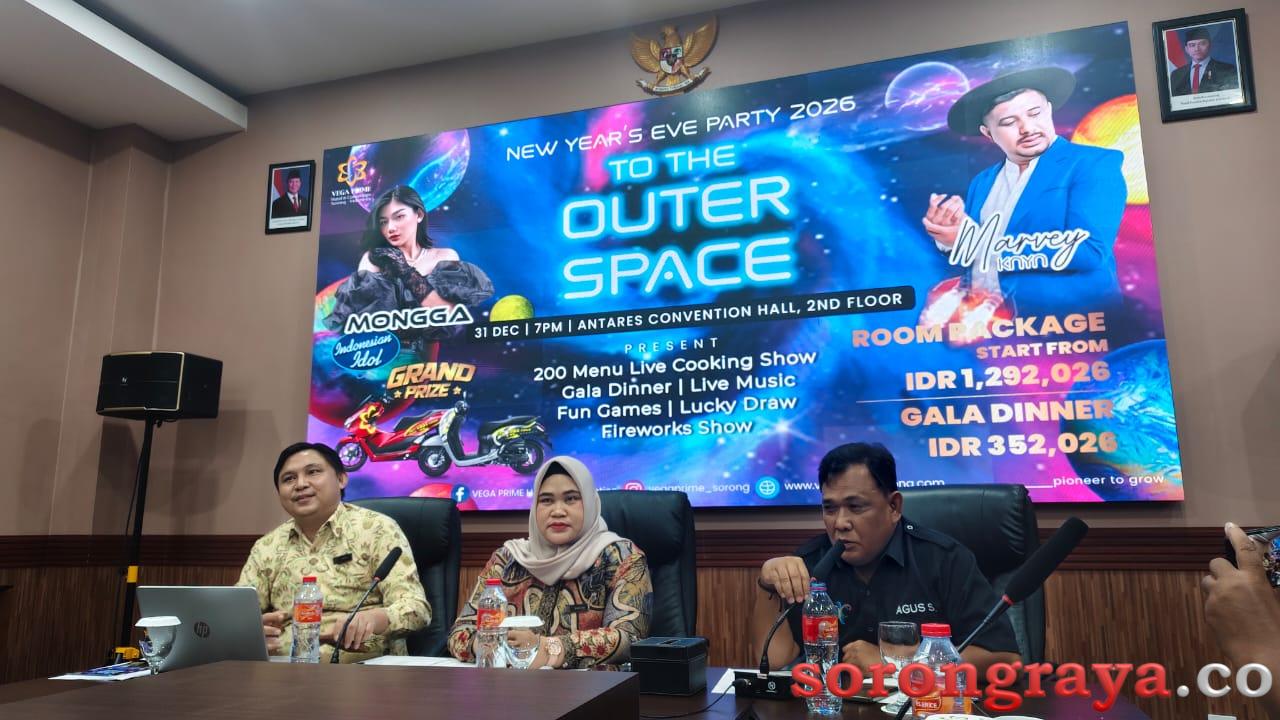 SORONG, sorongraya.co-VEGA PRIME Hotel and Convention kembali datangkan dua artis dimalam perayaan tahun baru ke-8 dengan tema”To The Outer Space”. Acara bertempat di Antares Convention Hall dan dimulai pukul 19.00 WIB ini mengusung konsep gala dinner eksklusif lengkap dengan pertunjukan musik spektakuler serta berbagai hiburan menarik.