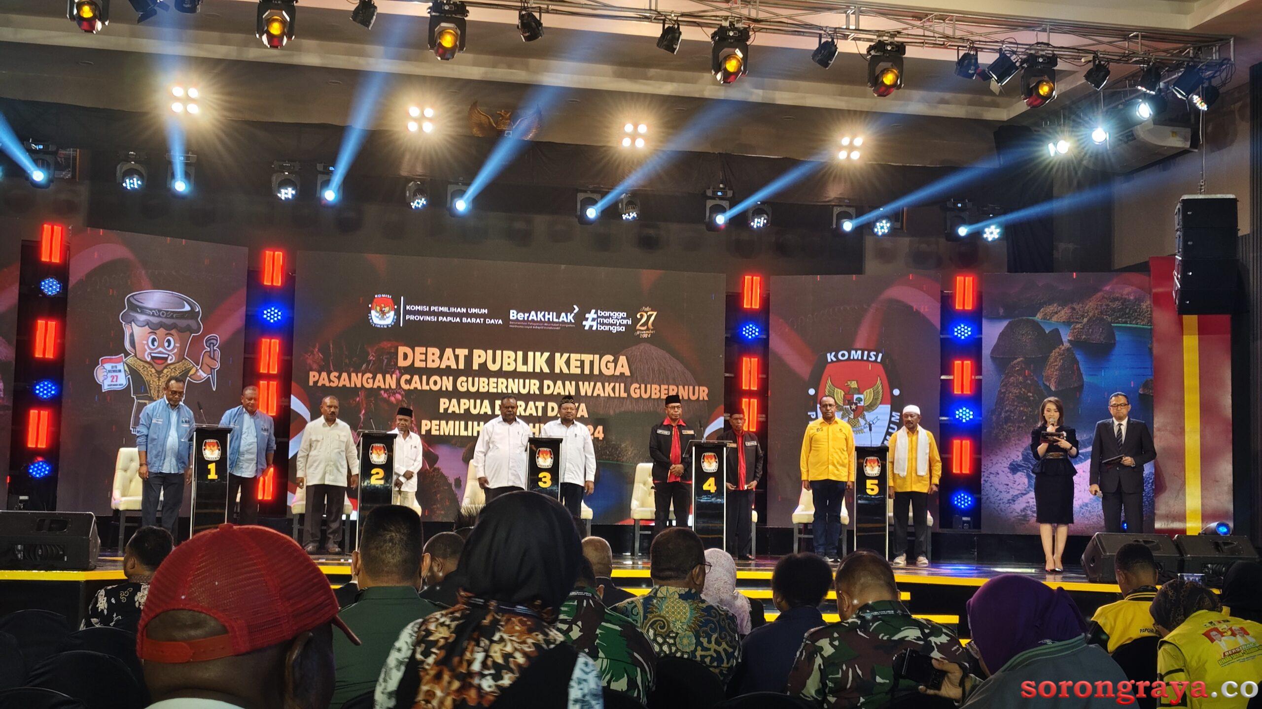 Dalam pelaksanaan Debat ketiga Cagub dan Calon Wakil Gubernur ini dihadiri lima Paslon yakni, pasangan nomor urut 1 Abdul Faris Umlati dan Petrus Kasihiw (ARUS), paslon nomor urut 2 Gabriel Asem -Lukman Wugaje (GAUL), paslon nomor urut 3 Elisa Kambu – Ahmad Nausrau (ESA), paslon nomor urut 4 Yoppie Onesimus Wayangkau – Ibrahim Wugaje (JOIN) kemudian paslon nomor urut 5 Bernad Sagrim – Sirajudin Bauw (BERSINAR).